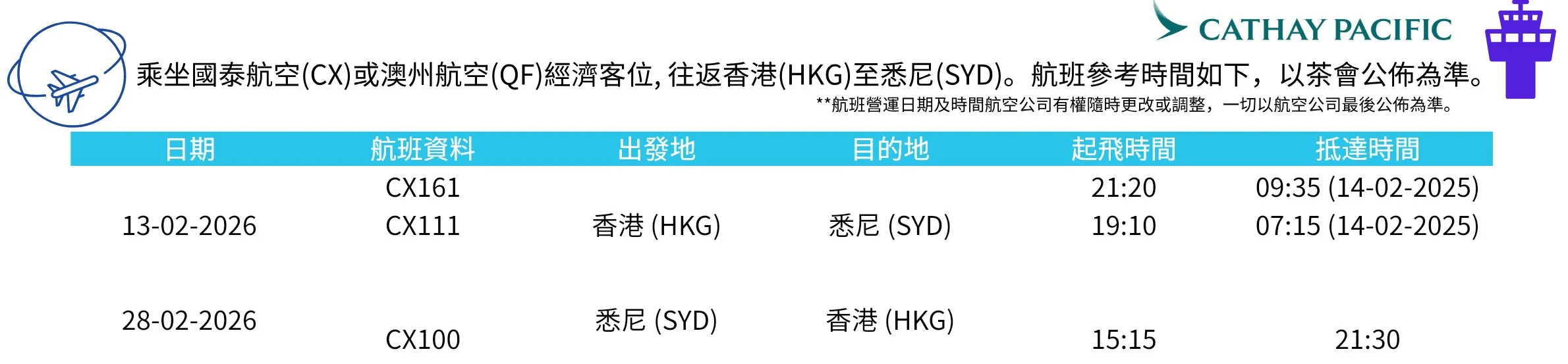 1. 國泰航空(CX) 香港來回悉尼 (SYD)經濟客位機票, 連寄艙行李。